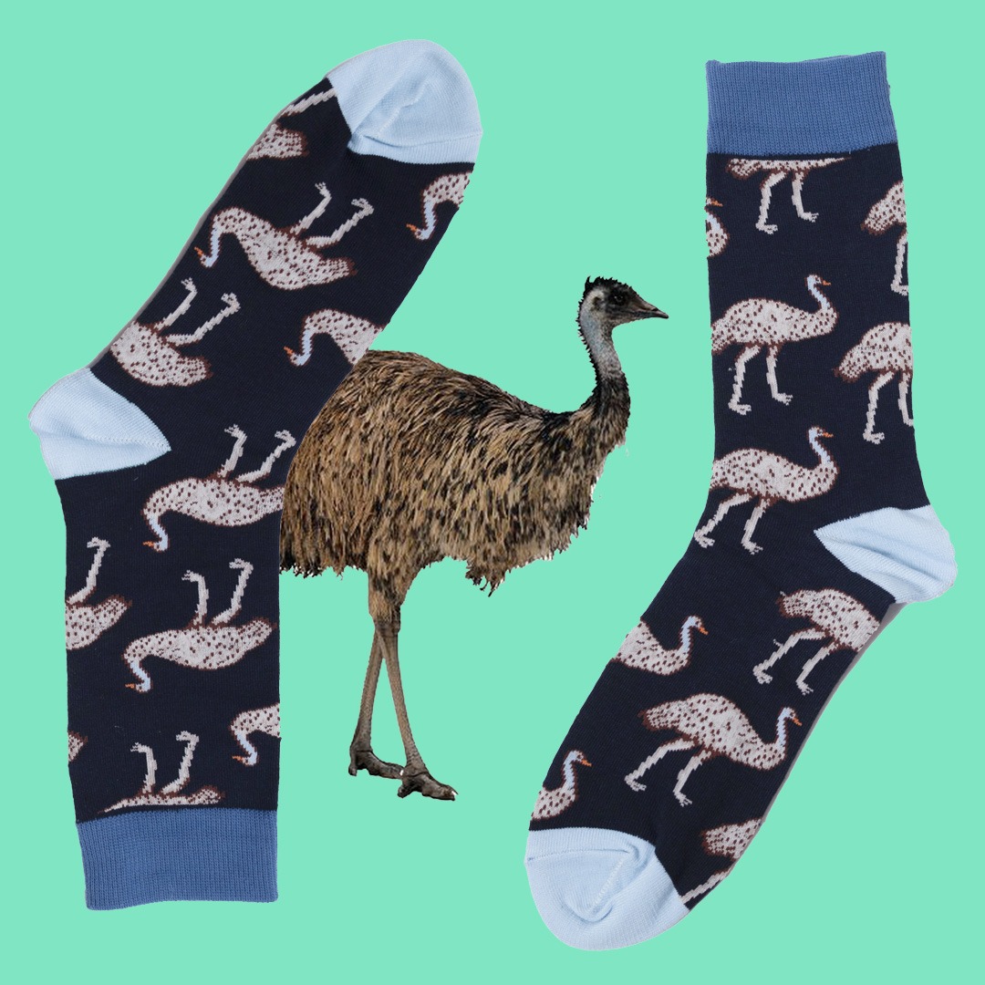 エミューが描かれた、脱力感あふれるデザイン。どこかシュールで愛らしい雰囲気があり、履くだけで気分も軽やかになります。