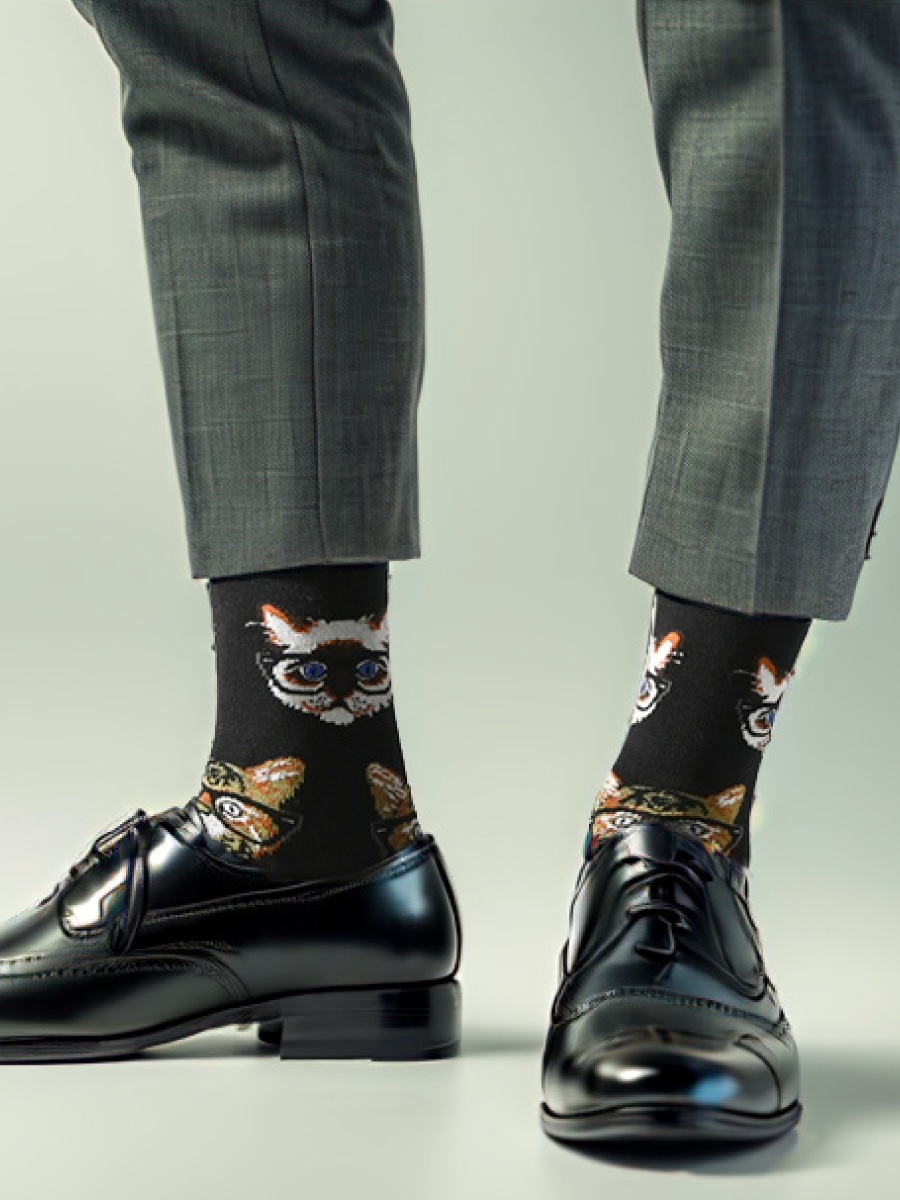 メガネをかけた猫のイラストが印象的な一足。モノトーンベースで落ち着いた雰囲気なので、スーツに合わせても違和感なし。