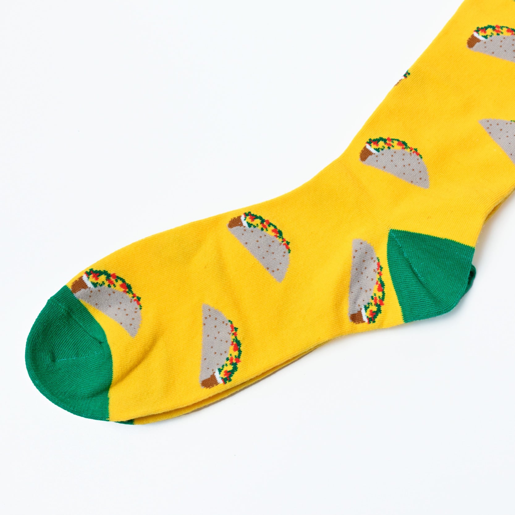 足元には美味しそうなタコスがゴロゴロ。これはもう、歩くたびにフードフェス!食べ物好きなあなたにピッタリの「タコスプリントソックス」。歩くたびにジューシーな香りが漂い、周りの注目を集めること間違いなし。